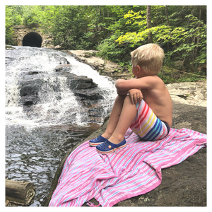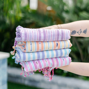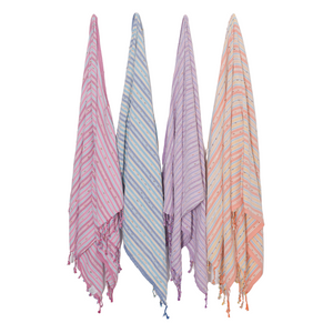 We are in love with this gauzy and lightweight pestemal in all of its bright and happy colorways, all interwoven with gold. The Halicarnassus is summertime in a towel and perfect for the beach or pool, to use as a cover up, or as a scarf/shawl for those cool summer evenings.