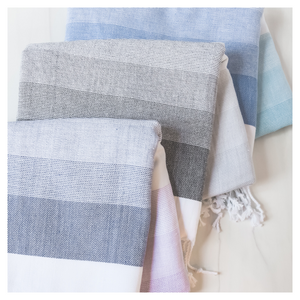 Named for the city in which our founder grew up, the Smyrna Peshtemal is the perfect combination of old and new: crafted with the traditional flat weave of Turkish towels, but with a modern ombre color block pattern. Thanks to the flat weave that is resistant to sand, this is an excellent beach towel but can be used for so much more!